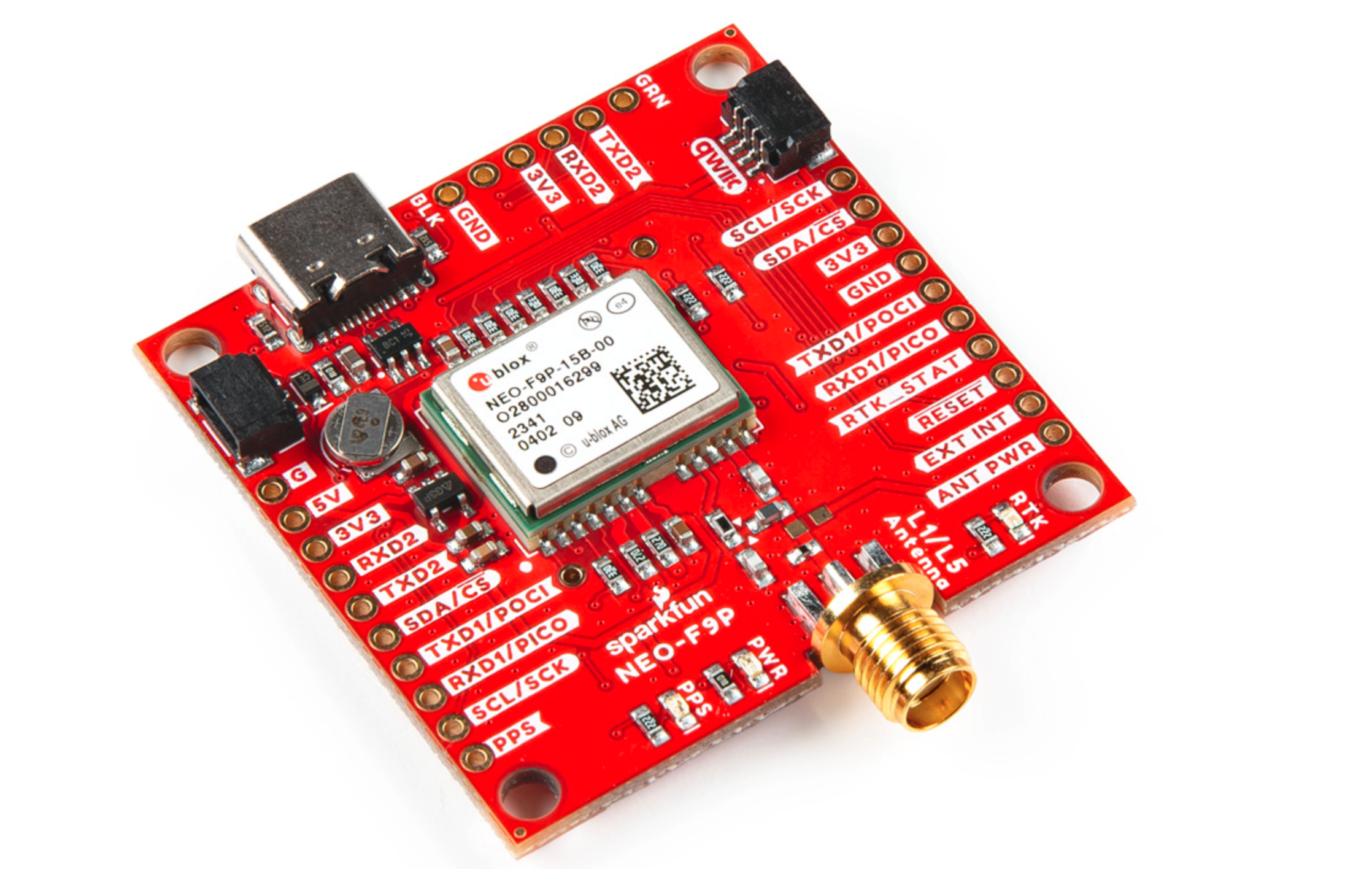 NEO-F9P 甚至有 5 个通信端口,它们都同时处于活动状态:USB-C(枚举为 COM 端口)、UART1(带 3.3V TTL)、用于 RTCM 接收的 UART2(带 3.3V TTL)、I2C 和 SPI。利用我们方便的Qwiic系统,无需焊接即可将其连接到系统的其余部分。但是,如果您更喜欢面包板,我们仍然突破了 0.1 英寸间距的引脚。