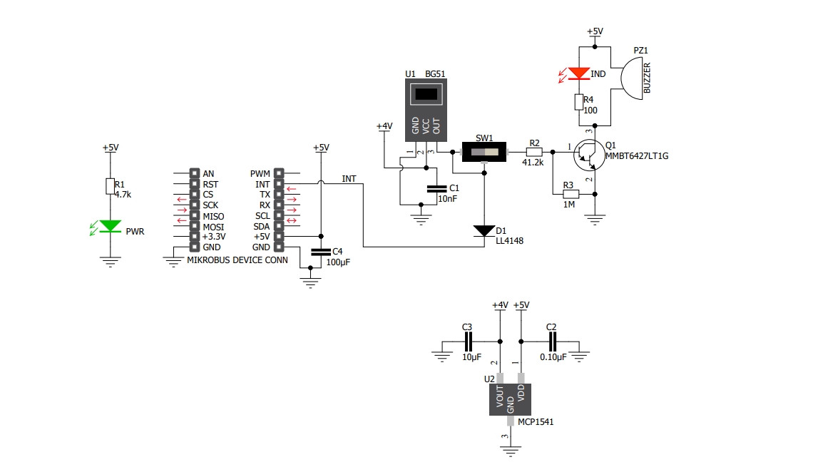 由于电荷载流子的产生,辐射 β、伽马和 X 射线与 p-i-n 二极管结构的相互作用在二极管结中产生暗电流。当暗电流达到峰值并在 mikroBUS™ 的 INT 引脚和 LED 指示灯/蜂鸣器上报告中断时,电子电路会检测到这一点。