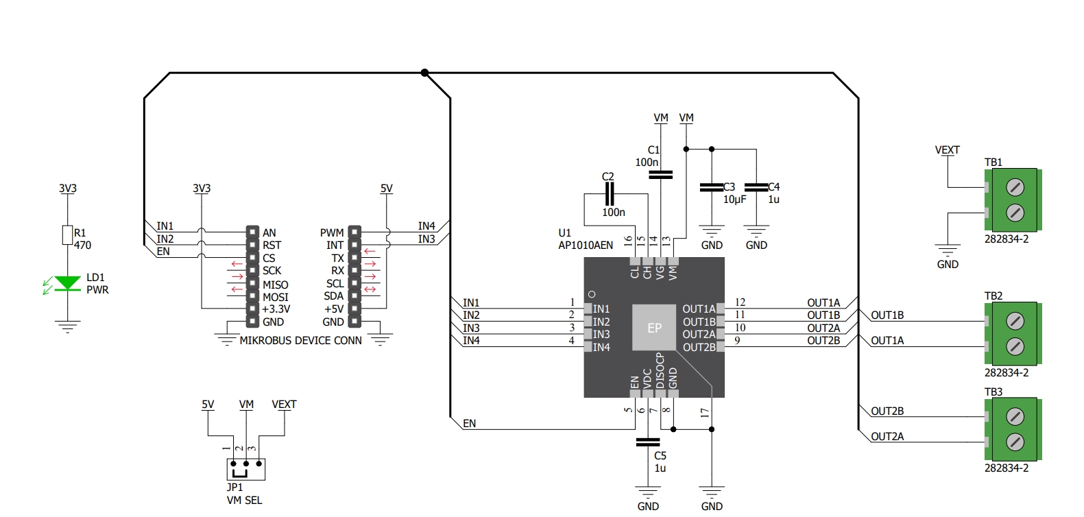如前所述,H-Bridge 4 Click 的主要组件是 AsahiKASEI (AKM) 的 AP1010AEN,它是一款两通道 H-Bridge 电机驱动器,兼容电机工作电压高达该 IC 是一款高效的集成 H 桥驱动器,每个开关的 RDS ON 输出非常低。一般而言,H 桥允许电流沿一个或另一个方向流动。输出级由四个采用 H 桥配置的 n 沟道 MOSFET 组成。输出具有短路和过热保护。该桥使用输入 IN1、IN2、IN3 和 IN4 进行控制,这些输入分别连接至 mikroBUS™ 上的 AN、RST、INT 和 PWM 引脚。