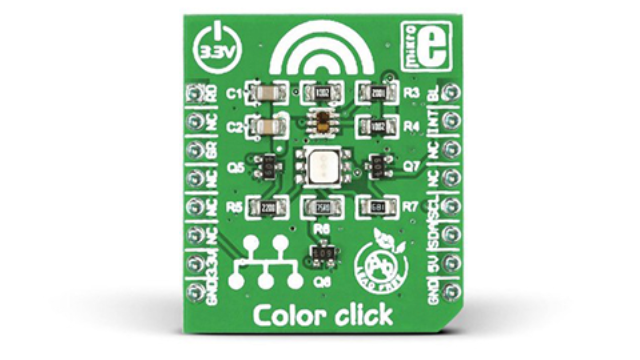 MIKROE Color Click 是一款彩色光感应 Click board™,采用流行的 TCS3471 集成颜色传感器。它能够感应红、绿、蓝光成分以及透明光。它具有 1,000,000:1 的极高动态范围,使 Click board™ 能够在各种光照条件下使用。它配备了额外的高亮度 RGB LED,因此甚至可以在完全没有任何光线的情况下使用。 TCS3471 传感器的可编程增益有助于实现最佳的颜色读取条件,而具有阈值的高级可编程中断引擎允许将事件报告给主机 MCU,而无需不断轮询寄存器以获取新数据。