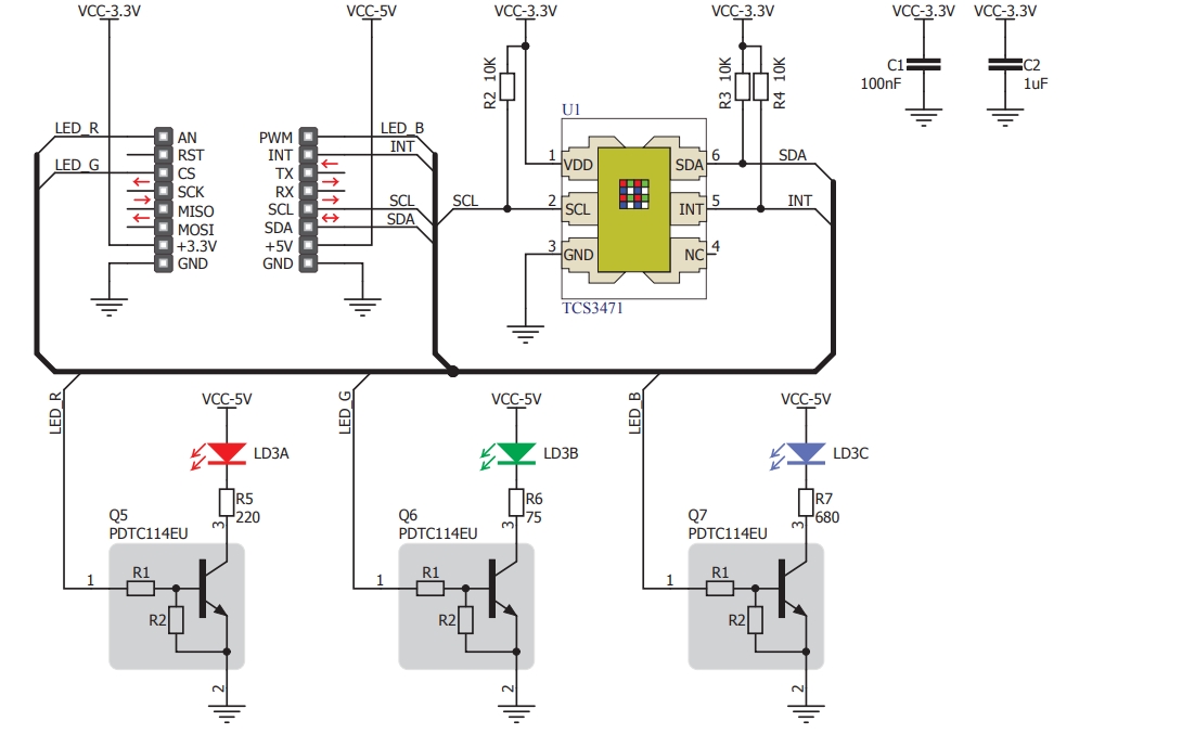传感器使用行业标准 I2C 接口与主机 MCU 交换数据。高亮度 RGB LED 可以简单地由 MCU 引脚驱动,因为它具有三个板载驱动晶体管,为各段提供足够的电流。 Click board™ 是各种彩色光传感应用或简单物体识别的理想解决方案。它可用于 RGB LED 颜色校正、背光调节、机器人技术中的物体颜色识别、光色温感测以及需要准确且灵活的颜色感测的类似应用。