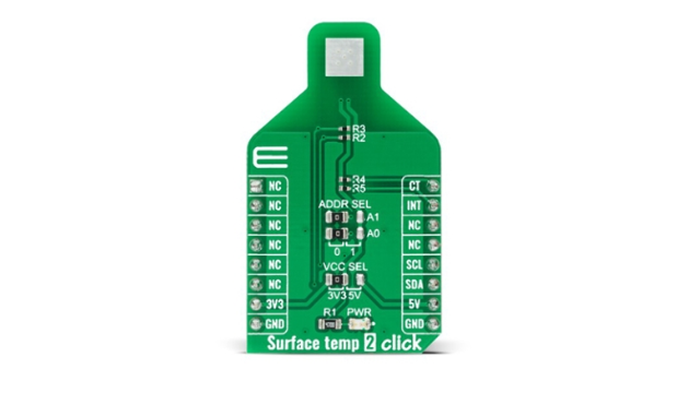 Surface temp 2 Click 是一款紧凑型附加板,包含高精度温度传感器,可在广泛的工业温度范围内提供突破性的性能。该板采用 ADT7422,这是 Analog Devices 的 16 位 I2C 温度传感器。 ADT7422 具有精密 ADC,可在 25°C 至 50°C 范围内提供 16 位温度测量,分辨率为 0.0078 °C,精度为 ± 0.1 °C。此外,它不需要额外的校准。这使得 Surface Temp Click 成为 RTD 和热敏电阻更换、生命体征监测 (VSM)、食品运输和储存、环境监测、HVAC 和其他应用的绝佳选择。