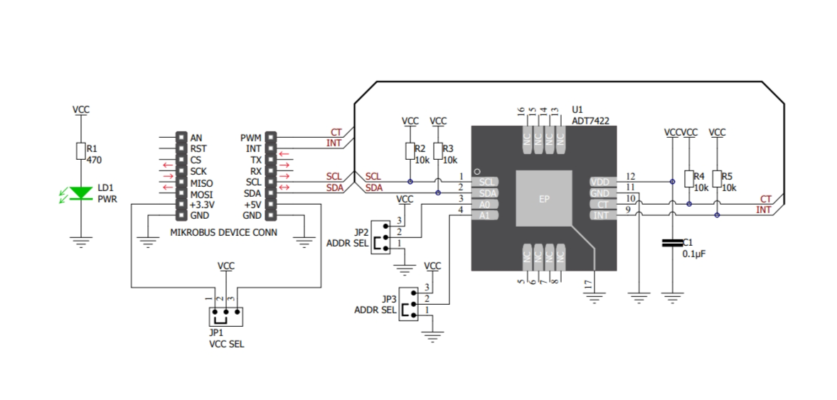 该 Click board™ 设计为可在 3.3V 和 5V 逻辑电压电平下运行,可通过 VCC SEL 跳线进行选择。这允许支持 3.3V 和 5V 的 MCU 正确使用 I2C 通信线路。