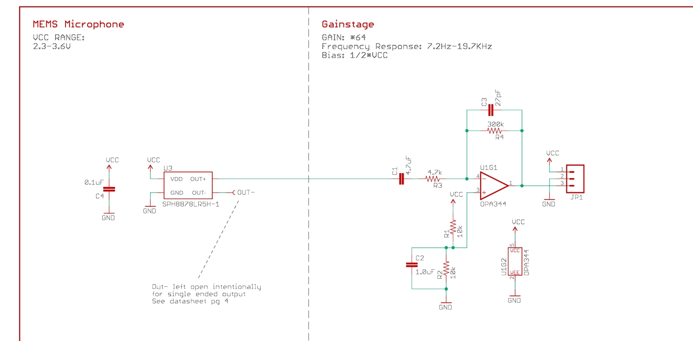 除了放大信号之外,OpAmp 还添加了 1/2 VCC 的偏置电压。对于距离麦克风几英尺远的声源(例如正常说话的声音),AUD 输出信号的峰峰值约为 200mV。另请注意,这款薄型麦克风的端口位于底部,因此麦克风可以与外壳的外表面齐平安装。该麦克风是全向的,这意味着它可以很好地拾取来自各个方向的声源。