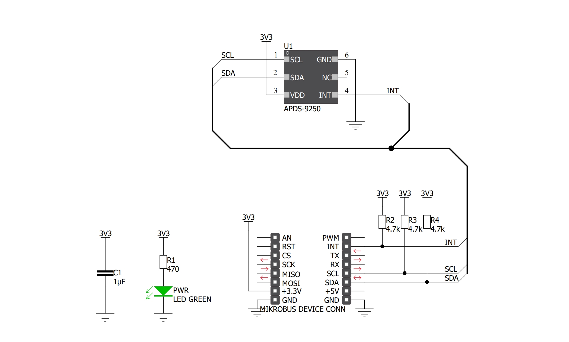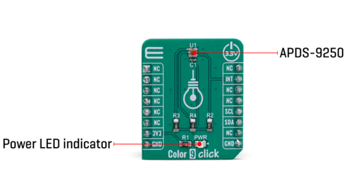 Color 9 Click 是一款非常准确的色彩感应 Click 板,采用 Broadcom 的 APDS-9250、IR 和环境光传感器。它包含专门设计的感光元件矩阵,可以感应红、绿、蓝和红外分量。四个低噪声 18 位 ADC 确保高动态范围,使该传感器适合在深色玻璃后面使用。该传感器提供快速 I2C 接口,用于与主机 MCU 通信。它非常适合感应细微的光线变化,因为它不仅配备了红、绿、蓝 (RGB),还配备了红外传感器,可以非常准确地测量最细微的光线变化。
