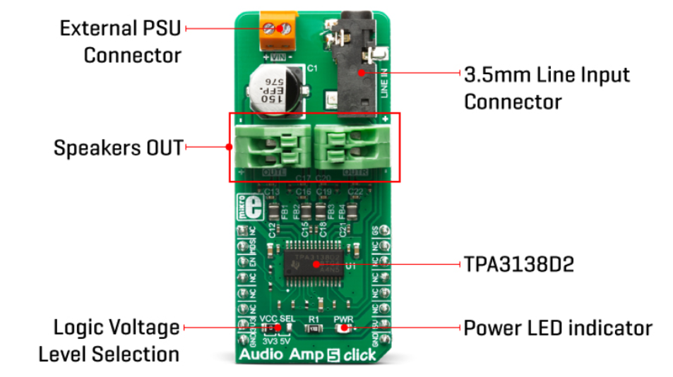AudioAmp 5 Click 是一款立体声音频放大器,在 8 个负载下每通道能够提供高达 10W 的功率。它基于 D 类集成放大器 TPA3138D2,采用高效开关方案。空闲模式下电流约为 20mA,可实现更长时间的运行并提高热性能,使其成为各种电池供电应用的完美选择。具有扩频控制的高级 EMI 抑制功能允许使用铁氧体磁珠滤波器代替笨重的电感器,同时仍保持所需的 EMC 水平。 TPA3138D2 IC 配备了一组保护功能,可实现可靠运行。