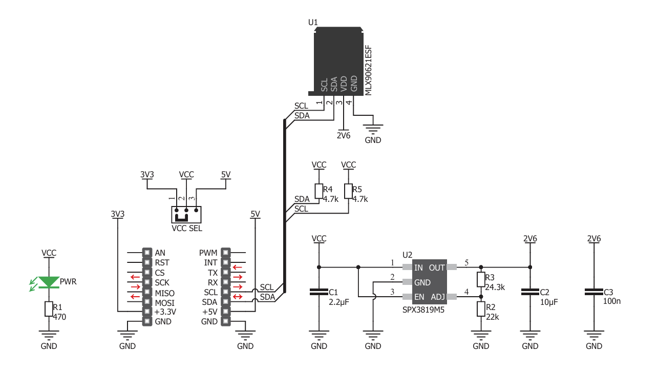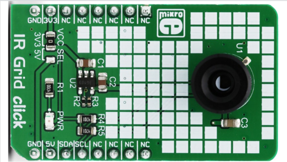 IR Grid click 是一种热成像传感器。它具有 64 个非常灵敏的工厂校准红外元件(像素)阵列,排列成 4 行,每行 16 个像素,每个元件在其局部视场 (FOV) 内测量高达 300C 的物体温度。此 Click 板上使用的 MLX90621ESF-BAD 红外传感器只有四个引脚,并且安装在行业标准 TO39 封装内。它配备2Kbit的EEPROM用于存储补偿和校准参数。 MLX90621ESF-BAD 红外传感器阵列 IC 具有 I2C 兼容数字接口,使其能够与各种不同的 MCU 连接。此 Click 板上使用的传感器提供 40 x 10 FOV。该传感器每秒可输出高达 512 帧 (FPS)。