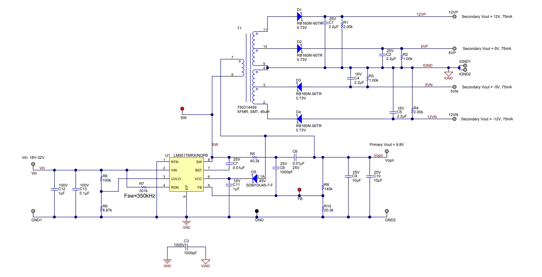 - 2.5W 的输出功率,+/-12V 和 +/-5V(电流均为 75mA)的输出电压,采用支持 7.5V 至 100V 输入电压范围的 LM5017