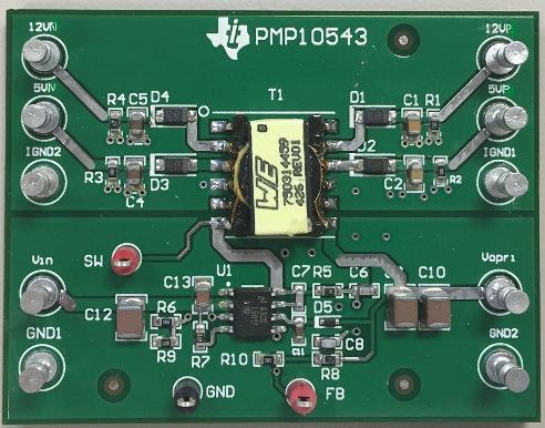 PMP10543 参考设计是一个低厚度、四路输出隔离型反激式电源,适合于工业应用。该电源包含一个同步降压稳压器 LM5017 和一个低厚度 (6mm) 变压器。它可生成四种隔离式输出:±5V 和 ±12V,电流均为 75mA。LM5017 是一个宽输入电压为 100V 的 600mA 同步降压稳压器。此设计具有 20V 到 32V 的输入电压范围,因而适用于 24V 输入电压的工业应用。此反激式设计可调节次级侧输出,无需光耦合器或辅助绕组,并且能够实现 ±5% 范围内的良好交叉调节性能。凭借 LM5017 的恒定导通时间控制,该器件无需环路补偿,因此可以简化设计,帮助减少外部器件数和降低 BOM 成本。
