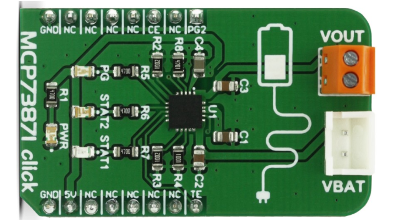 MCP73871 click 是一款完全集成的系统供电和锂聚合物/锂离子电池充电管理解决方案。 Click 具有许多锂聚合物/锂离子电池充电优化功能,用于最大限度地延长电池寿命。 MCP73871 的部分功能包括恒流和恒压充电算法、过压保护、自动充电结束控制、自动再充电功能、耗尽电池预处理和热管理。