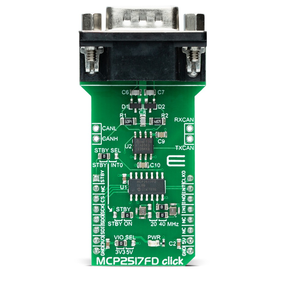 MCP2517FD Click 是一款紧凑型附加板,代表完整的 CAN 解决方案,用作 CAN 网络中的控制节点。该板采用 MCP2517FD 和 ATA6563、带 SPI 接口的外部 CAN FD 控制器以及 Microchip 的高速 CAN 收发器。 ATA6563 是低级物理层 IC (PHY),提供与 CAN 总线本身的物理连接,而 CAN 控制器 MCP2517FD 代表 MCU 和 PHY 之间的接口。它具有三种操作模式,具有专用的故障安全功能、通过 CAN 远程唤醒以及在 CAN 总线上断电时的理想被动行为。该 Click 板适合开发各种汽车诊断应用,甚至在不支持 CAN 接口的 MCU 上也是如此。