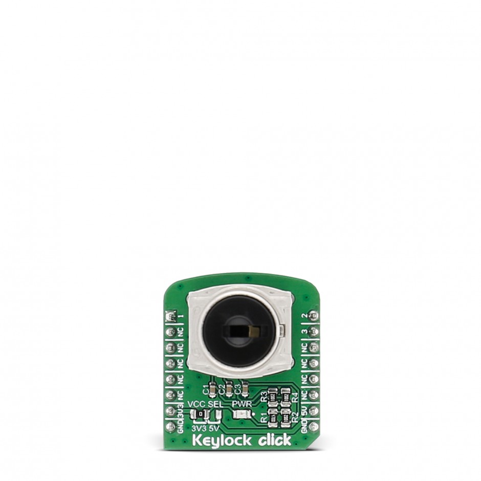 Keylock Click 带有经过加工的密封钥匙锁机构,可以设置在三个不同的位置。 Click 设计为在 3.3V 或 5V 电源下运行。它通过 mikroBUS 线路上的 PWM、INT 和 AN 引脚与目标微控制器进行通信。