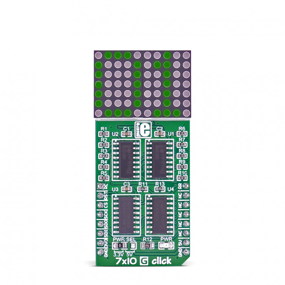 7x10 G click是一款LED点阵显示click,可以用来以非常简单易行的方式显示图形或字母。 Click 板有两个 LED 点阵模块,带有 7x5 时尚、圆形、点状 LED 元件。这些显示器可产生干净、均匀的图案,因为元件彼此光学隔离,并且相邻 LED 单元之间没有漏光。此外,矩阵单元的开启和关闭时间经过优化,可实现清晰、流畅的显示性能,无闪烁或滞后。