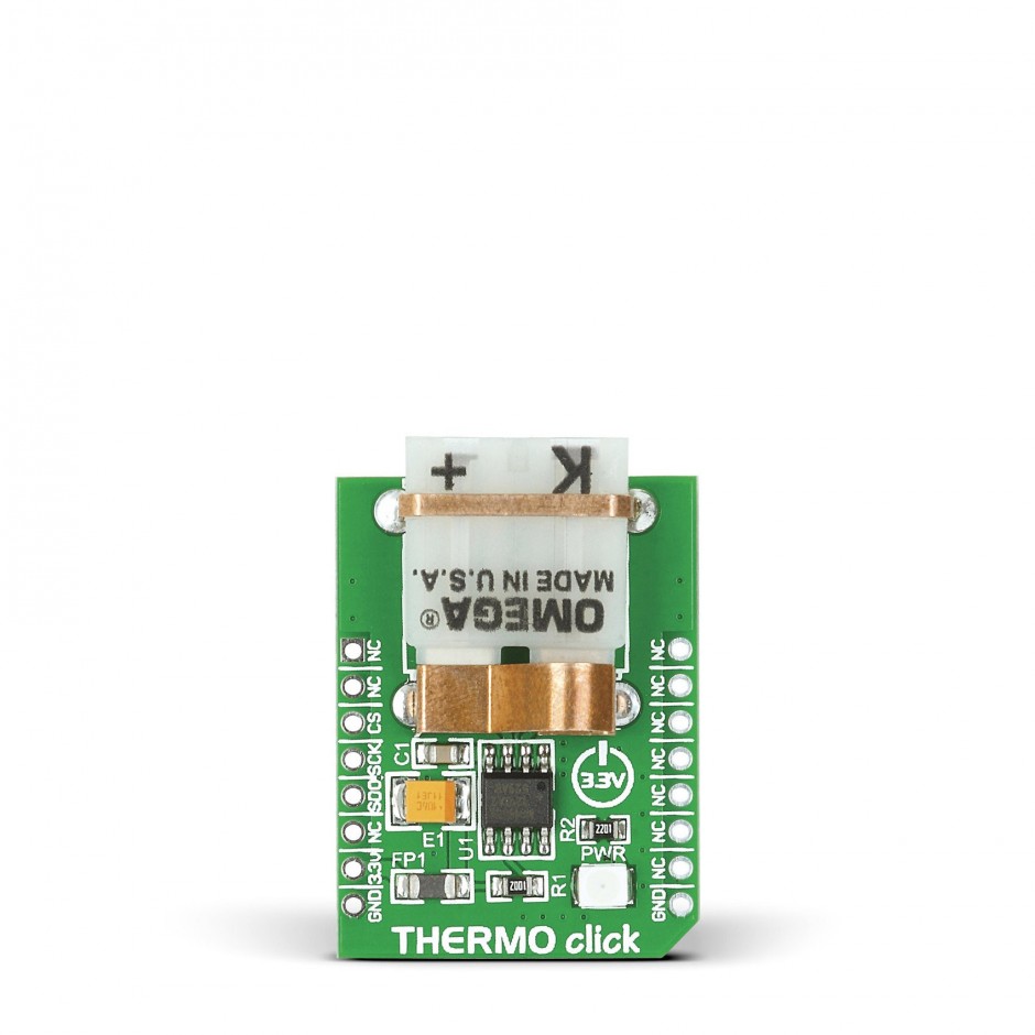 THERMO Click 是一款紧凑型附加板,可提供精确的温度测量。该板采用 Analog Devices 的热电偶数字转换器 MAX31855K,以及用于 K 型热电偶探头的 PCC-SMP 连接器。 MAX31855K与PCC-SMP连接器的组合可在-270至1372°C的温度范围内实现高精度温度测量,灵敏度约为41μV/°C。该器件还包含冷端补偿传感和校正,通过 SPI 接口(只读)向主机控制器提供温度数据。该 Click 板适用于恒温、过程控制、监控应用等。