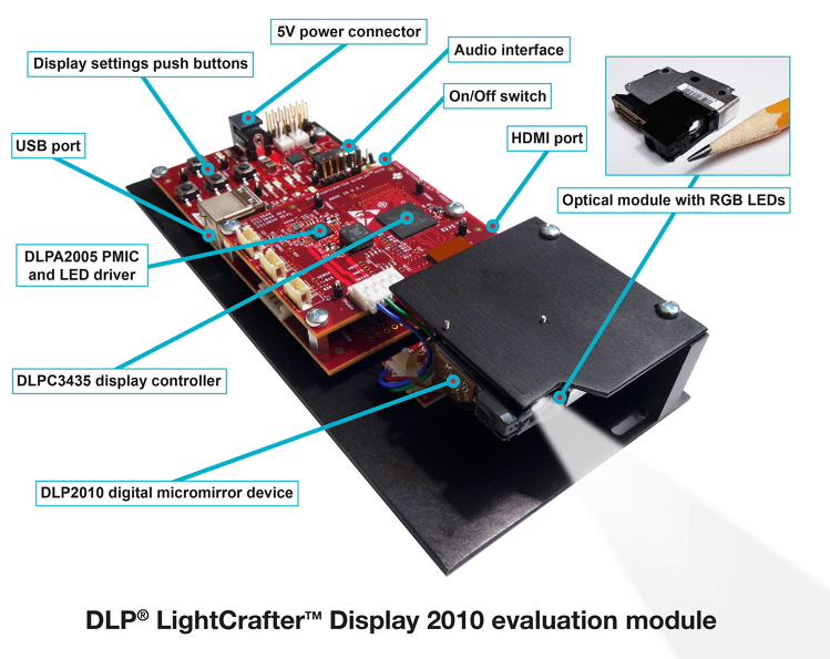 - DLP2010 芯片组的参考设计,该芯片组包含 DLP2010 DMD、DLPC3435 控制器和完全集成式 DLPA2005 PMIC/LED 驱动器