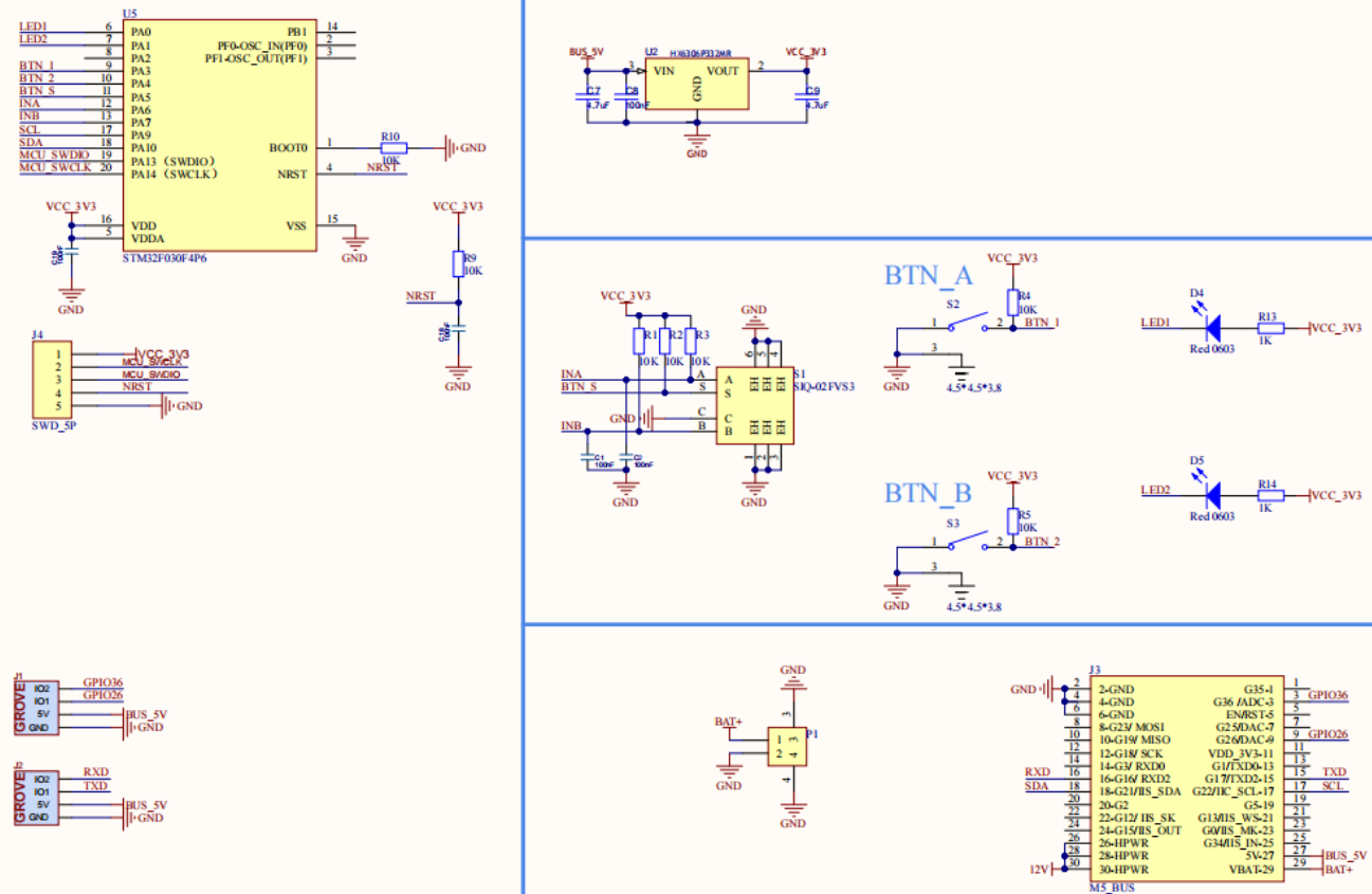 HMI模块是人机交互模块,提供旋转编码器、两个输入按钮和两个LED指示灯,采用STM32F030作为采集和通信MCU,通过I2C与M5主机通信。另外,模块上还有portB和portC接口,内置500mAh锂电池。该模块适用于需要手持操作员交互的各种应用。