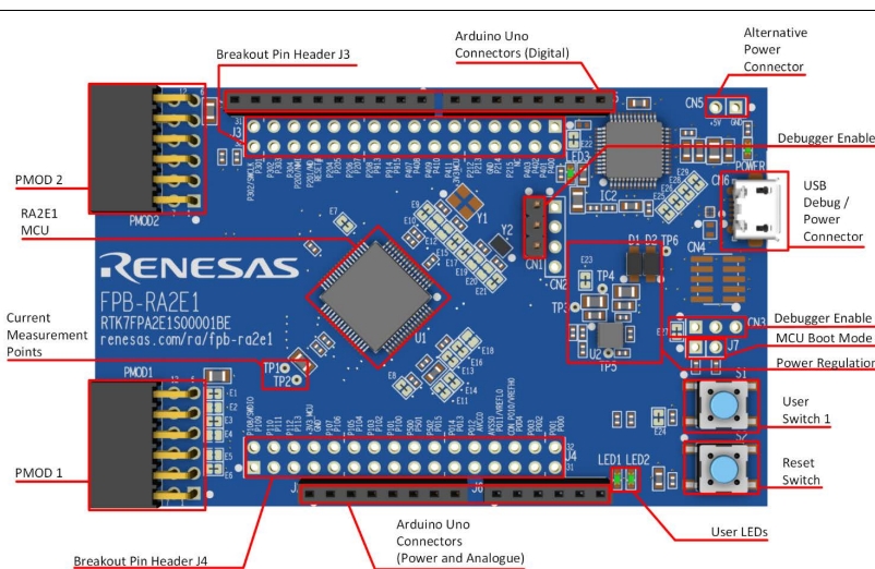 RA2E1 快速原型开发板是一款专为多种应用原型开发而设计的评估板,搭载了 R7FA2E1A93CFM 微控制器。这款开发板具备内置仿真器电路,功能与 E2 仿真器精简版等效,允许用户无需额外工具即可进行程序的编写和调试。此外,开发板配备了标准的 Arduino Uno 接口和 Pmod 接口,提供了对微控制器所有引脚的直接访问,增强了其可扩展性。为了演示 RA2E1 MCU 的功能,提供了示例软件,并可用于连接 RA2E1 快速原型开发板与多种无线模块或传感器模块。在使用蓝牙、LoRa 和 Wi-Fi 等功能时,请确保遵守各个国家的无线电法规。