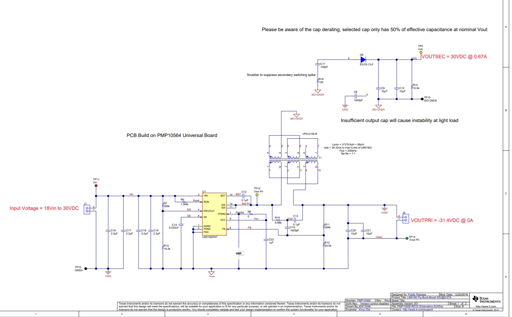 PMP10559 是一种采用负初级电压的非同步隔离式 Flybuck 升压转换器。该电源包含一个同步降压稳压器 LM5160 和一个多功能封装变压器。此设计接受 18V 至 30V 输入电压,提供 30V 输出,并且能够为负载提供 0.67A 电流,因此非常适合 24V 输入的工业应用。此 Fly-Buck 拓扑可调节次级侧输出,无需光耦合器或辅助绕组,并且能够实现 ±5% 范围内的良好调节性能。凭借 LM5160 的恒定导通时间控制,该设计无需环路补偿 - 这可以简化设计,帮助减少外部器件数和降低 BOM 成本。PMP10559 是一种采用负初级电压的非同步隔离式 Flybuck 升压转换器。该电源包含一个同步降压稳压器 LM5160 和一个多功能封装变压器。此设计接受 18V 至 30V 输入电压,提供 30V 输出,并且能够为负载提供 0.67A 电流,因此非常适合 24V 输入的工业应用。此 Fly-Buck 拓扑可调节次级侧输出,无需光耦合器或辅助绕组,并且能够实现 ±5% 范围内的良好调节性能。凭借 LM5160 的恒定导通时间控制,该设计无需环路补偿 - 这可以简化设计,帮助减少外部器件数和降低 BOM 成本。