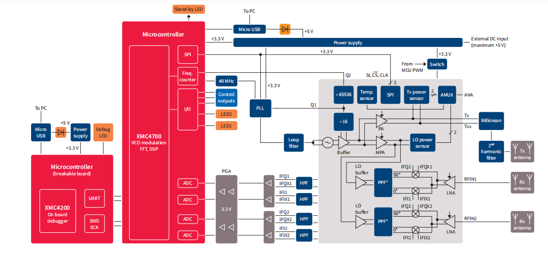 XENSIV™ 24GHz BGT24MTR12 雷达传感器快速啁啾 FMCW 演示板是 Infineon 提供的一款开发工具,它利用 BGT24MTR12 RF 收发器和 XMC4700 系列的 32 位 ARM® Cortex®-M4 微控制器单元(MCU),以实现在 24 GHz 工业、科学和医疗(ISM)频段的多种传感应用。这些应用包括跟踪、碰撞避免、无人机避障、机器人避障和人员跟踪。演示板能够通过快速啁啾 FMCW 技术和两个接收天线来获取目标的角度、距离、速度和运动方向。该开发套件包含预编程的演示板,使用 Infineon 的 DAVE™ 开发工具,具备同时跟踪多个对象的能力。此外,还提供了 PC 应用程序 GUI,用于在时间和频率域中显示和分析获取的数据,以及用于高级调试和算法开发的雷达时域信号提取。