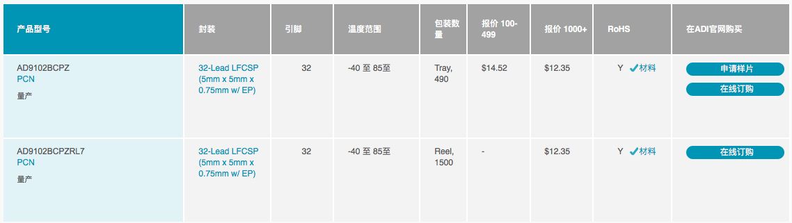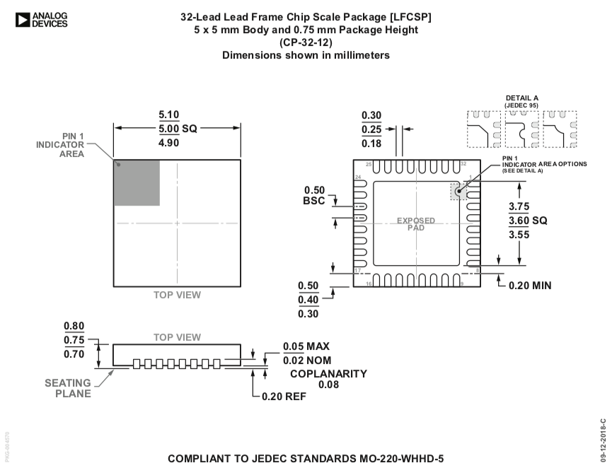小尺寸、32引脚5mm x 5mm LFCSP无铅封装,3.6 mm × 3.6 mm裸露焊盘