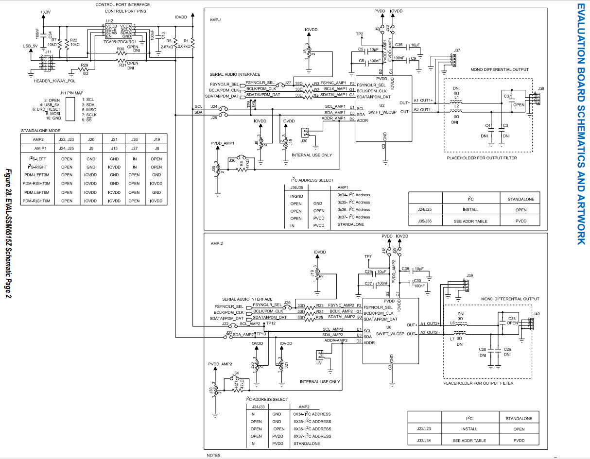 设计简述:图 40 显示了使用单通道的典型应用I2S/TDM 输入和 I2C 控制。 PVDD 电压由外部提供。数字输入数据可以是 2 通道 I2S 或多通道 TDM格式,并且必须在 SAI 控件中选择所需的格式寄存器。上电时,设备保持断电状态,除非处于独立状态模式。要启用放大器,SPWDN 位必须设置为 0。一旦该位设置为 0,放大器将打开并开始输出交换。通过向 SOFT_FULL_RST 写入 1,可以将设备重置为默认设置。通过向 SOFT_RST 写入 1,可以在保持寄存器设置的同时复位器件。默认情况下,高通滤波器被禁用以实现最低功耗和最低延迟。可以通过将 DAC_HPF_EN 寄存器设置为 1 来启用高通滤波器。可以读取故障状态寄存器 0x13 以检查运行期间的任何故障情况