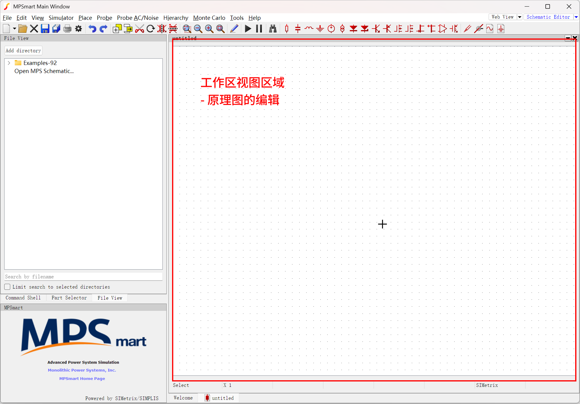 在工作区视图中(右侧部分),分别包含原理图编辑器和波形查看器: