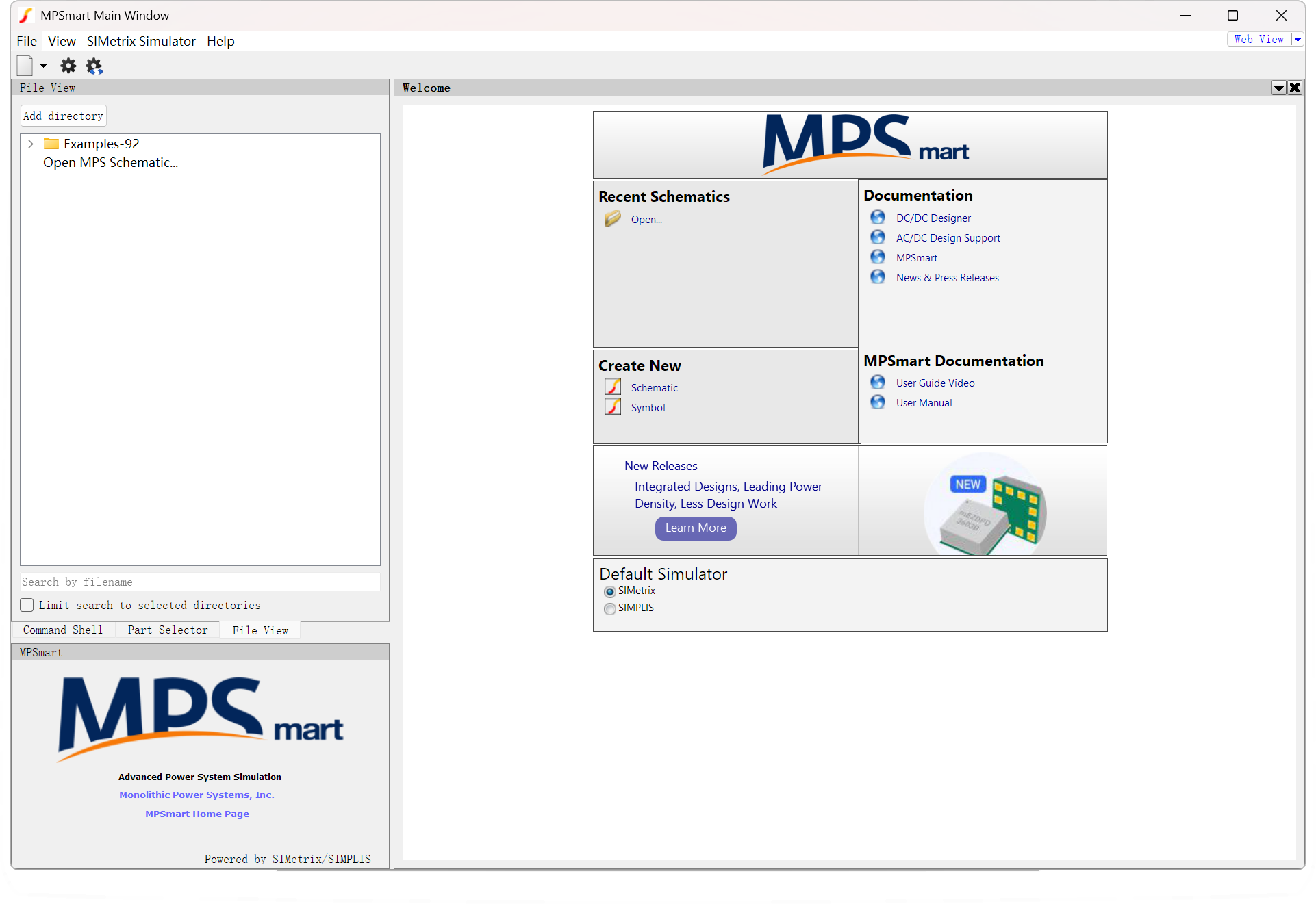 - 文件视图:文件视图显示文件及相应文件夹的分层列表。其中的 “Examples”是随 MPSmart 自动安装的默认文件夹。在默认示例文件夹中,单击标题为“MPS”的文件夹将显示 MPS 产品模型。在文件视图下,单击Add Directory按钮,选择常访问的文件夹并将其添加到文件视图列表中。用户可在“文件视图”面板中打开、重命名、删除或管理文件夹及文件。