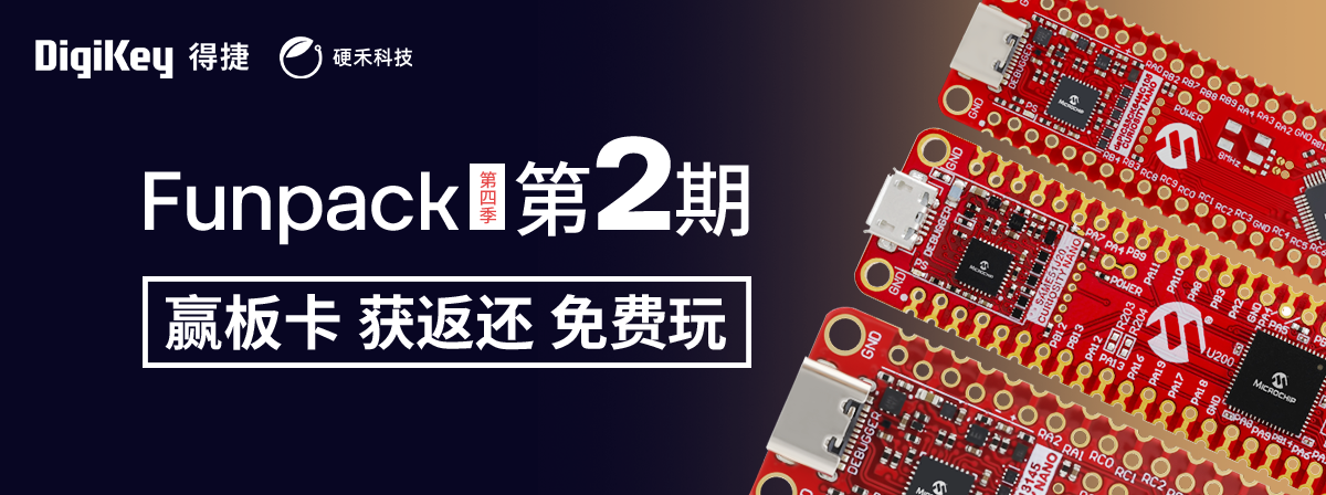Funpack活动是硬禾学堂联合DigiKey发起的“玩成功就全额退”活动。前三季活动已圆满结束,现在迎来第四季,本季共3期。每期活动我们会推出多款全球顶级半导体厂商的开发板/仪器套件,参与者可从中任选一款并通过指定“得捷购”购买板卡,并在规定时间内完成指定任务,就可以获得购板返还,项目优秀者另有额外奖励。