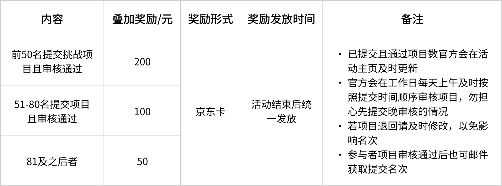 完成挑战部分项目且审核通过者进入优秀项目奖励评选。官方后期将根据参与情况开放额外奖励,敬请期待。