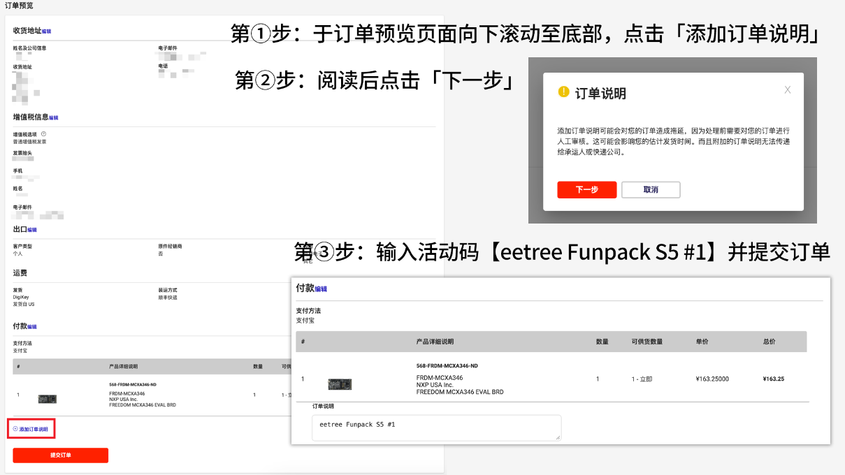 第五季第1期板卡是来自NXP的新品FRDM-MCXA346,由于库存问题,本期参与者需先报名参与,两周后放开库存和下单链接,并于一周内点击“得捷购”完成下单(库存仅有50个,已报名者需尽早下单,下单前需填写活动码),订单除下单活动板卡外,可根据任务自选其他模块一起下单,完成任务最高返300元,不满300按订单金额返。若错过下单或遇缺货需等得捷补货后于活动时间内继续下单,完成任务必须用到活动板卡。