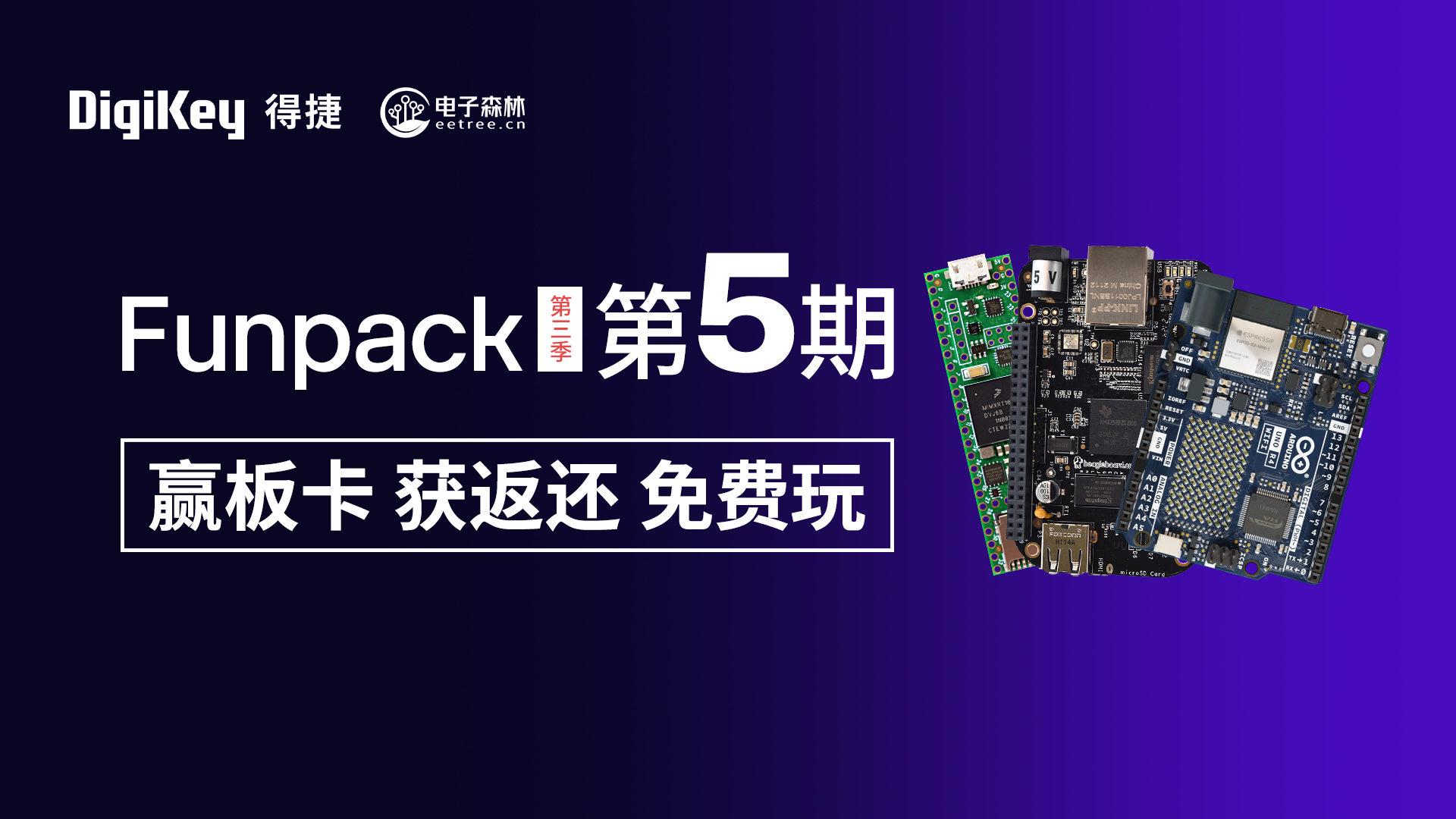 Funpack第三季第五期共有三款活动板卡:BeagleBone® Black 是一款面向开发人员和业余爱好者的低成本、高扩展、并有社区支持的开发平台;Teensy 4.1是一款基于NXP的i.MX RT1062高性能微控制器的开发板;Arduino UNO R4 WiFi 则结合了瑞萨电子的RA4M1微处理器和乐鑫的ESP32-S3,专为Arduino爱好者设计。