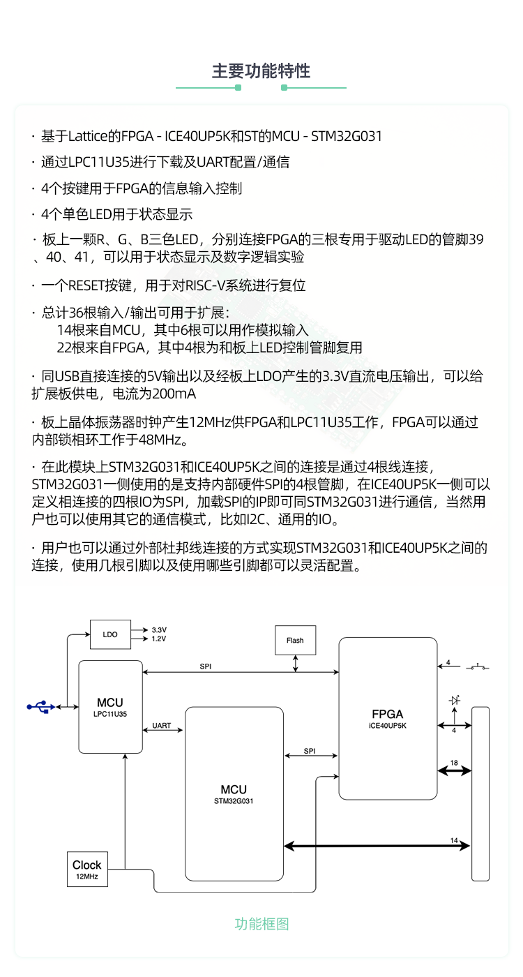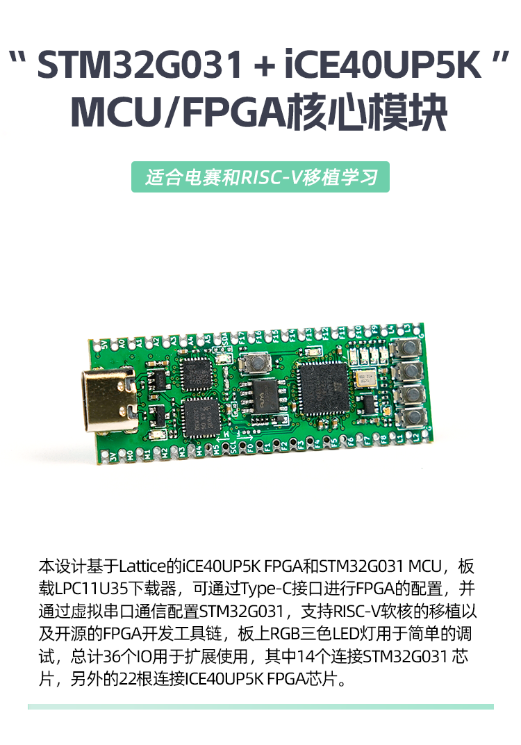 核心板支持小脚丫或MCU+FPGA混合架构,本次活动是搭配基于STM32G031 + iCE40UP5K的MCU+FPGA核心板使用: