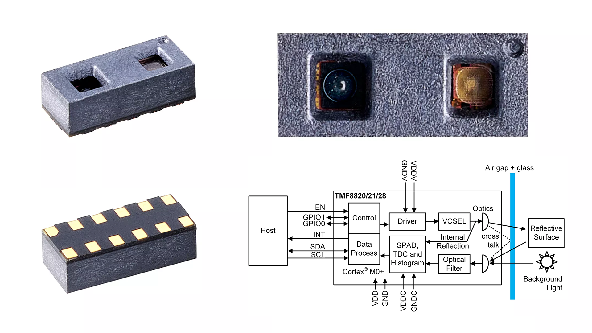 dToF模块是基于 TMF8821 设计的直接飞行时间 (dToF) 传感器模块,TMF8821采用单个模块化封装,带有相关的 VCSEL(垂直腔面发射激光器)。dToF 设备基于 SPAD、TDC 和直方图技术,可实现 5000 mm 的检测范围。由于它的镜头位于 SPAD 上,它支持 3x3、4x4 和 3x6 多区域输出数据以及宽广的、动态可调的视野。VCSEL 上方的封装内的多透镜阵列 (MLA) 拓宽了 FoI(照明场)。原始数据的所有处理都在片上进行,TMF8821在其 I2C 接口上提供距离信息和置信度值。