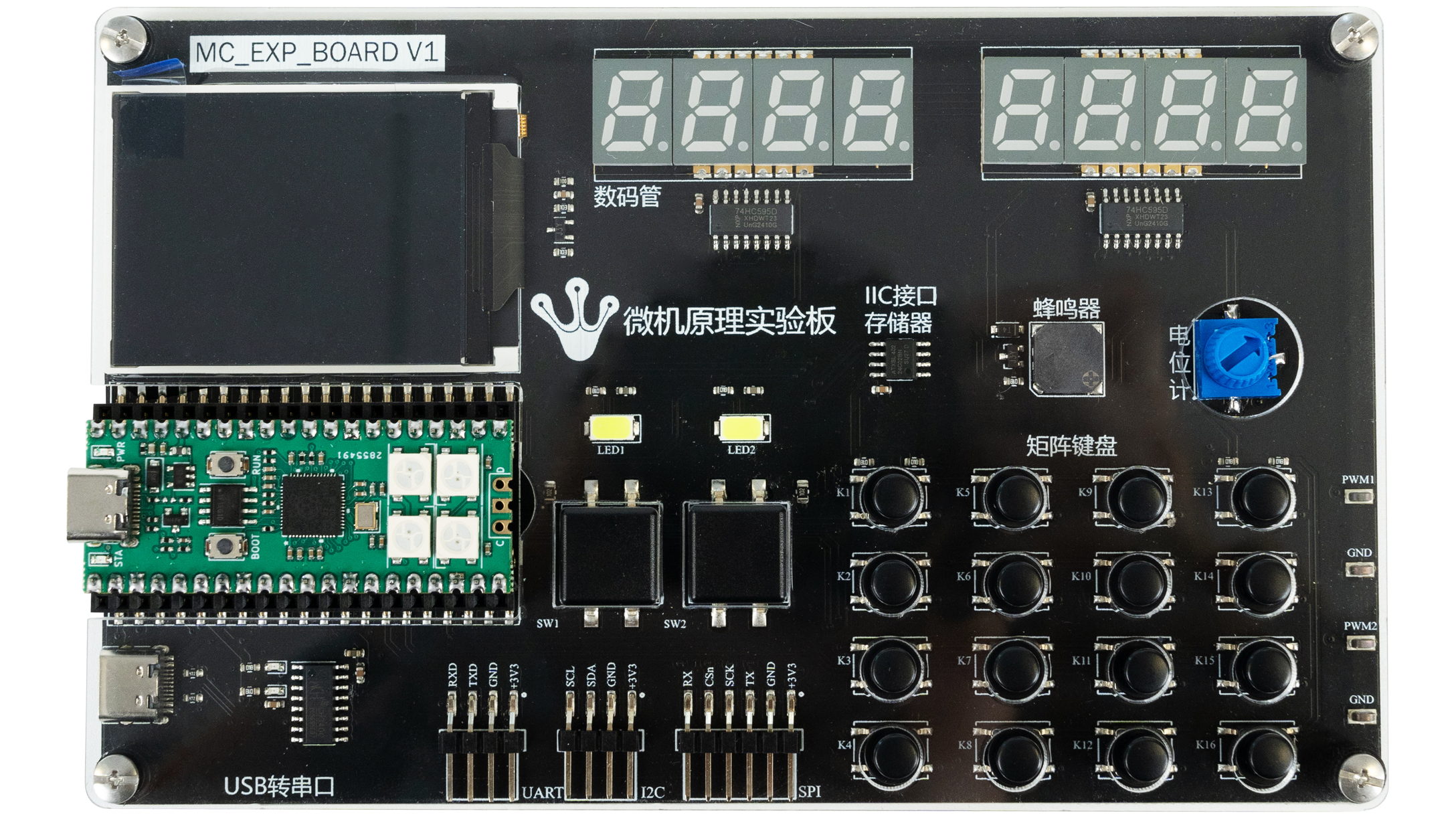微机原理实验板是一款基于树莓派 RP2040 微控制器的嵌入式系统学习平台,使用Type-C 接口供电。RP2040 微控制器作为实验板的主控,拥有有双 Arm Cortex M0+内核和 264KB 的 SRAM 内存,可通过 Micro Python 或 C/C++语言编程,性能强大的同时适用人群广泛。板上有丰富的输入、输出外设,满足微机原理课程的硬件需求,可通过教材示例深刻体会嵌入式系统的开发及微机原理的系统学习。