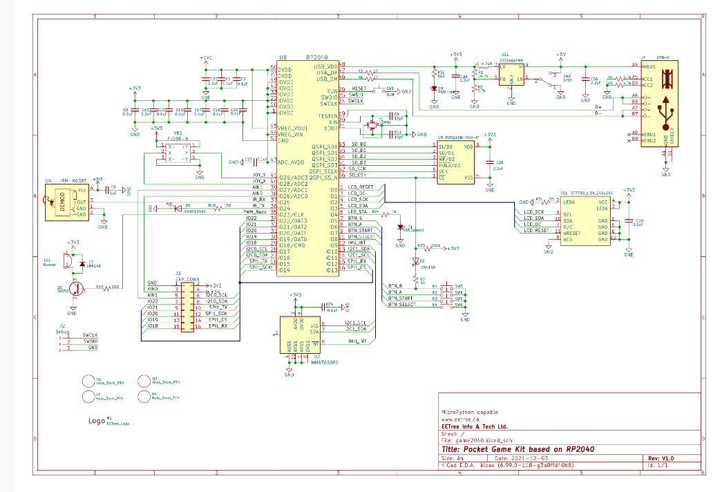 基于树莓派RP2040的嵌入式系统学习平台,通过USB Type-C连接器供电,采用RP2040作为主控,具有双核Arm Cortex M0+内核和264KB内存,可通过MicroPython或C/C++编程,性能强大。板上四向摇杆 + 2个轻触按键 + 一个三轴姿态传感器MMA7660用做输入控制,并有240*240分辨率的彩色LCD屏显示,片内温度传感器、并支持外部4路模拟信号输入,内部ADC采样率高达500Ksps。可玩性极高。在这个项目中只涉及到了A键和B键的使用。