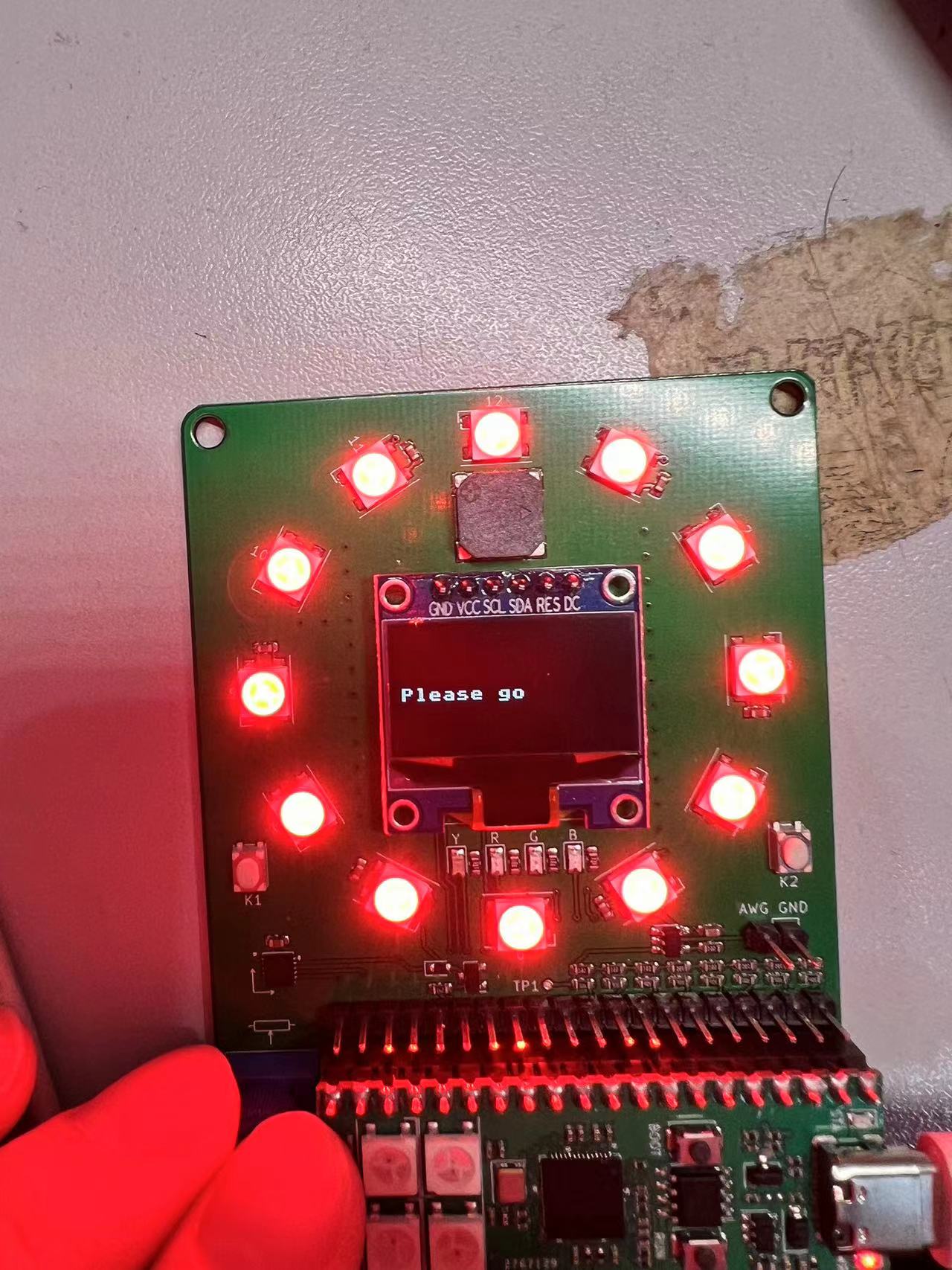 点击运行,十二个LED灯根据指令循环显示红色,黄色,绿色,黄色状态,为车辆通道的交通指示灯;屏幕上显示的是对行人的提示。当为红灯时候,车辆等待,屏幕上出现“Please go”字样,提醒行人通行;当为黄灯时候,行人与车辆均等待,屏幕上出现“Please wait”字样;当为绿灯时候。车辆通行,屏幕上出现“Please stop”字样,提醒行人等待。