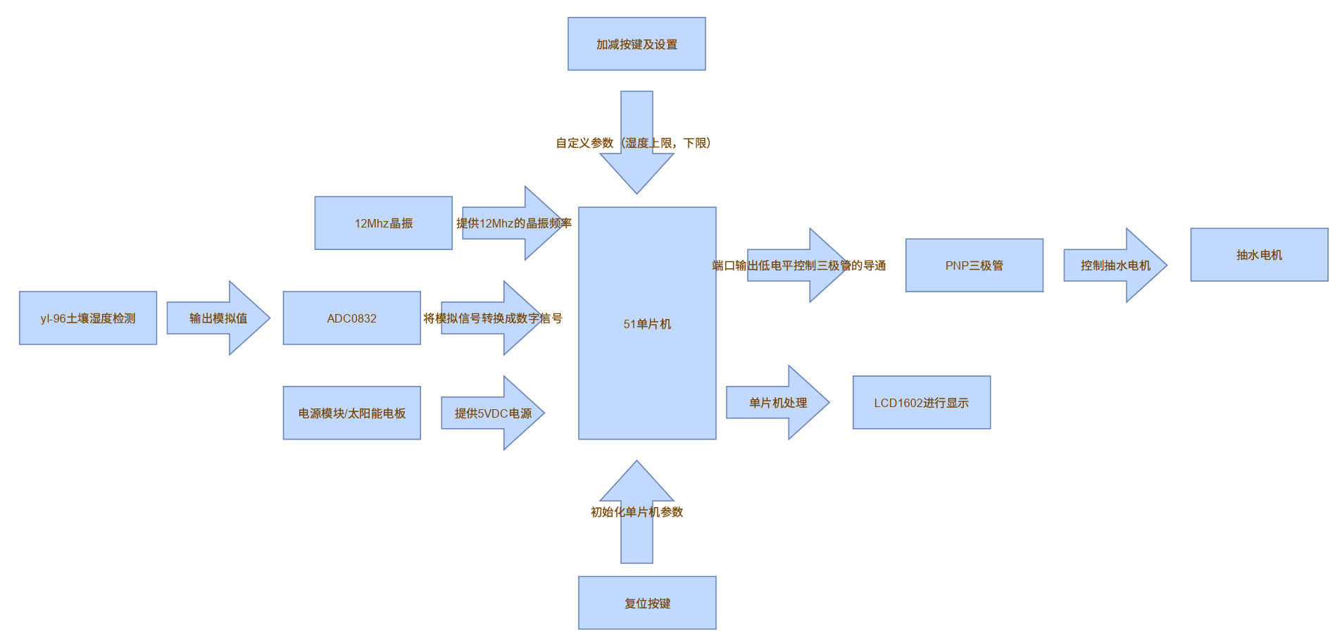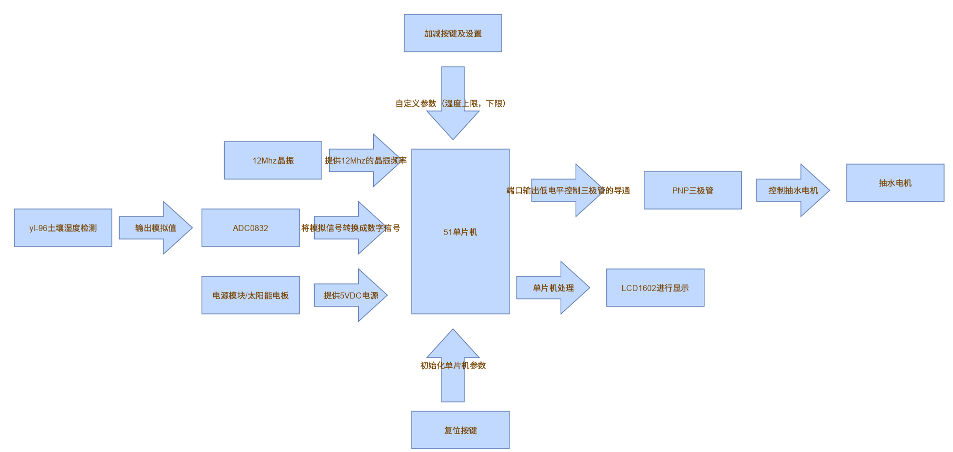 主要组成部分由AT系列的AT89C51单片机、模数转换器ADC0832,yl-69土壤湿度传感器和LCD1602液晶显示屏组成。yl-69将采集到的湿度样本作为输入信号传送到ADC0832。在单片机工作需要采集数据时,发出指令启动模数转换器。此次自动浇灌系统设计要达到的目标就是通过在单片机程序内设定浇灌湿度值,当采集的湿度样本低于设定湿度值时,开始浇水,高于湿度值,则报警器工作,发出信号,停止浇水。