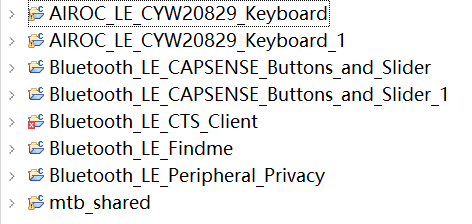 ModusToolBox中为每一块开发板提供了丰富的例程供开发者参考,但是很可惜,没有与BLE HID(Bluetooth Low Energy Human Interface Device)有关的例程。此外,这里的蓝牙例程们还有一个问题,它们都需要英飞凌推出的蓝牙调试工具连接,如果下载到开发板上不能用手机直接进行连接,不便于调试,所以我选择了更改开发平台,在同样支持这块开发板的RT-Thread Studio上开发。