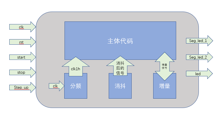 项目分为四个模块:主体逻辑实现,分频模块,消抖模块,递增模块