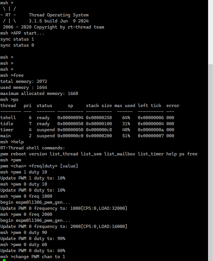 为了更灵活的调节pwm,使用 rtthread msh 组件实现了一个pwm指令