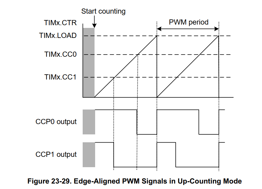 从下图可以看出LOAD寄存器和PWM频率相关,一个PWM周期=LOAD CNT*定时器周期。占空比和CC寄存器有关系。CC寄存器配置的数值不能超过LOAD寄存器