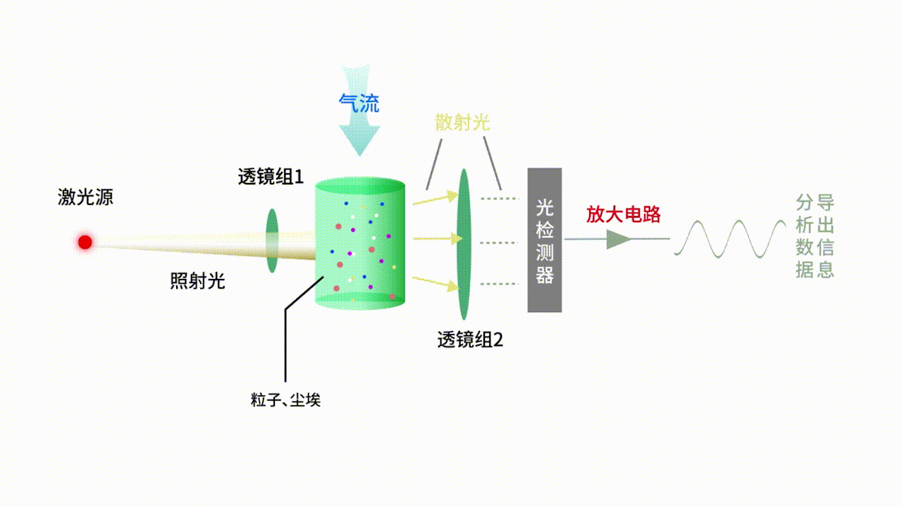 对于空气中的颗粒物的检测主要利用激光散射原理和光学检测技术。通过稳定的气体对流系统,使外界空气均匀的通过测量腔。激光照射在测量腔中的悬浮颗粒物上产生散射,同时在某一特定角度收集散射光,得到散射光强随时间变化的曲线, 可以精确的获得粒子的尺寸、速度和质量等信息。加以统计学原理,继而计算出总的粒子质量,从而实时的得到空气中PM2.5以及PM10等直径的颗粒物的含量浓度。