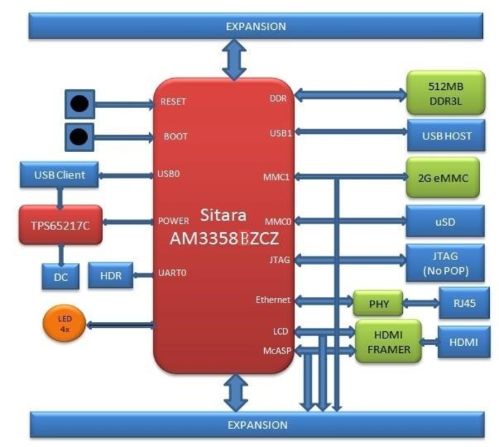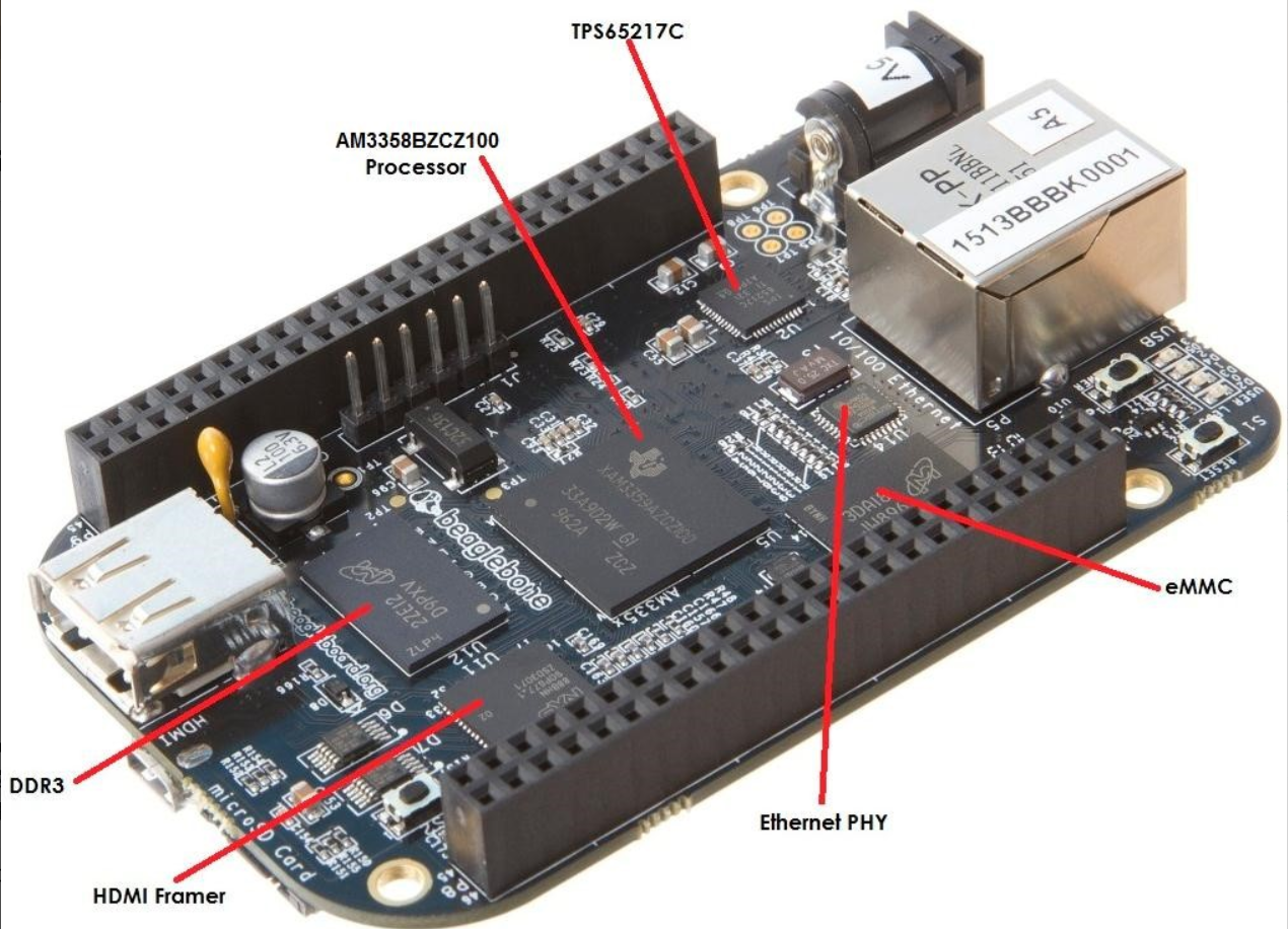 BeagleBone Black 是一款面向开发人员和业余爱好者的低成本、高扩展、社区支持的开发平台,板卡处理器选用的是 TI 公司 AM3358 芯片, 处理器集成了高达 1GHz 的 ARM Cortex™ A8 内核,具有强大的处理能力并提供了丰富的外设接口。BeagleBone® Black面向开源社区用户、开源硬件爱好者和任何对Arm Cortex-A8低成本处理器感兴趣的人而设计,配备精简,旨在为不需要搭建完整开发平台并想体验Arm处理器功能的用户提供入门的捷径。它配备了最低限度的外设,使用户能够体验处理器的强大功能,还提供了许多接口,用户还可以开发自己的电路板或添加自己的电路。