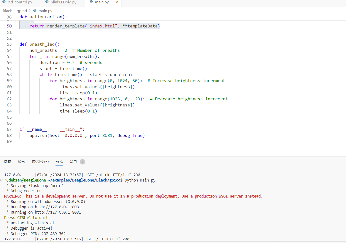 然后当连接上以后就要先将系统控制LED的代码进行禁止了,我们好自己去调用LED,然后拉高LED,和拉低LED,然后使用FLASK和板卡进行互通,就能使用网页去控制LED了。