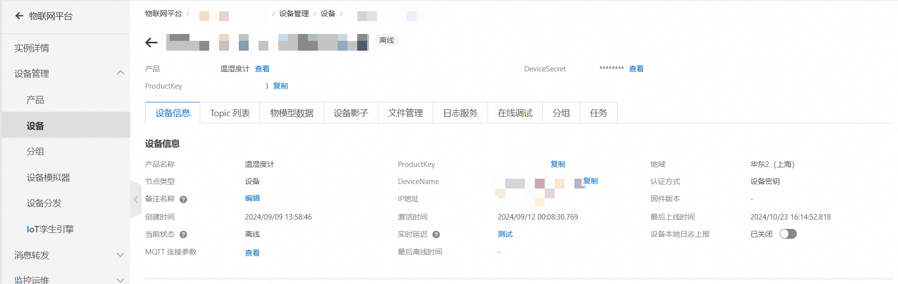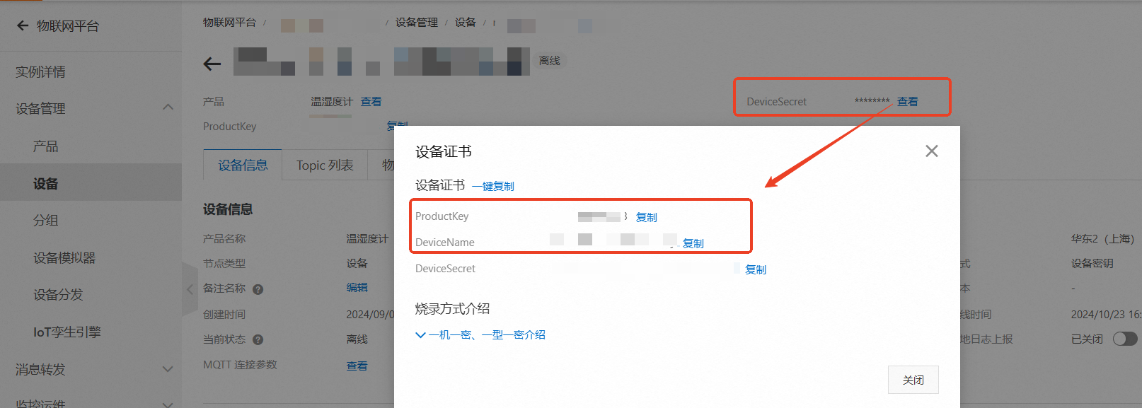 ProductKey和DeviceName可以在如下位置获取