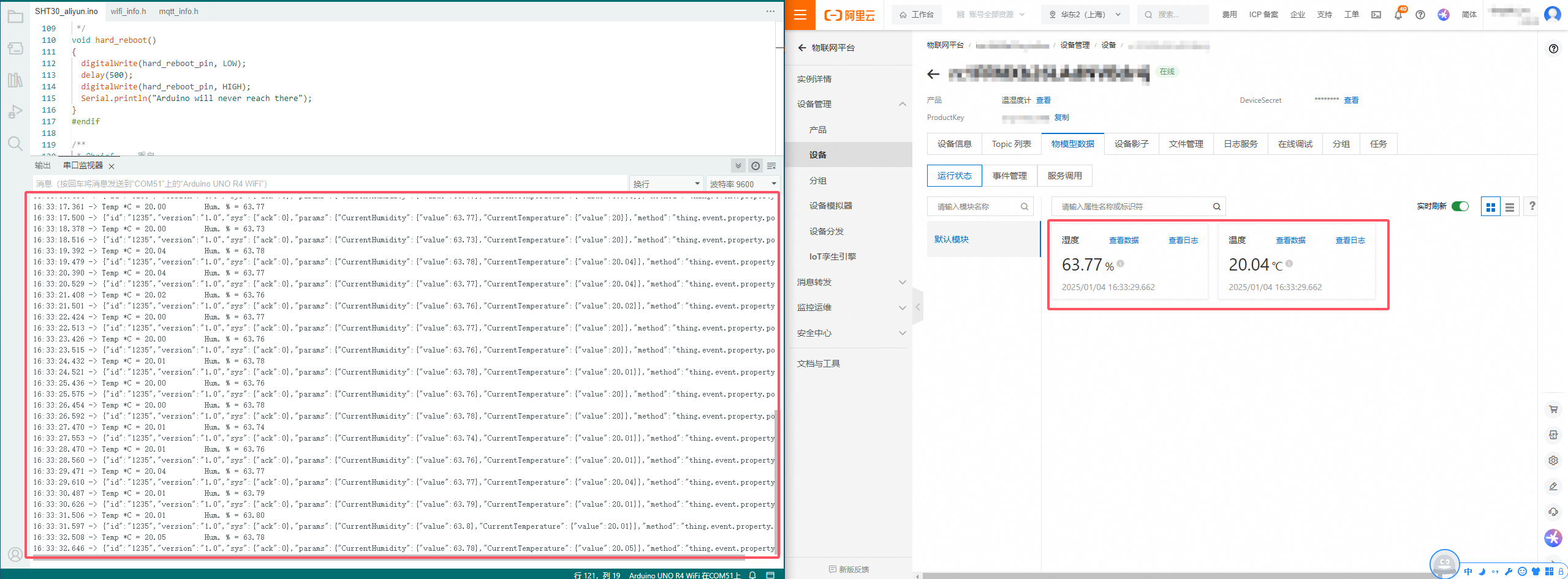 设备日志及阿里云后台实时数据显示截图