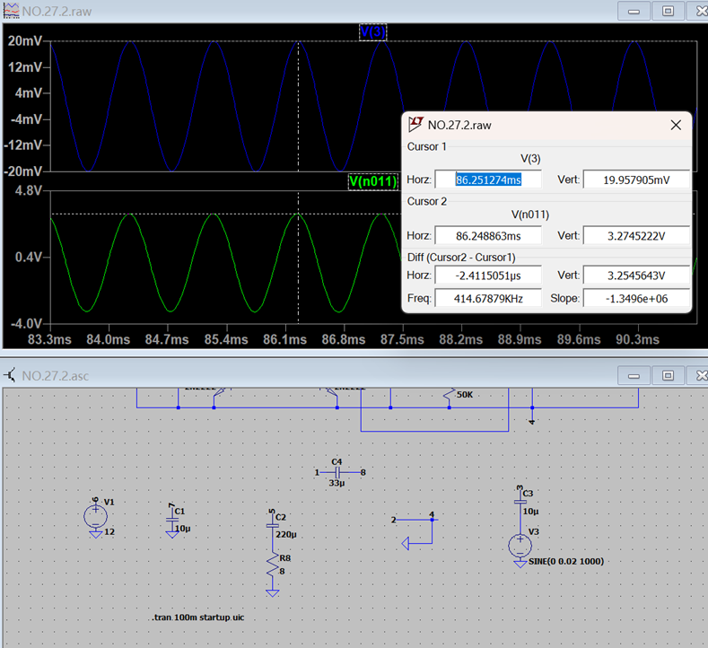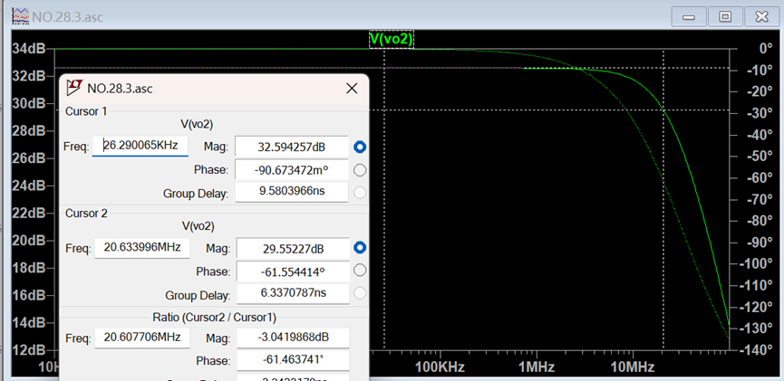 信号源VI1为幅值25mV,频率30MHz的正弦波,利用瞬态分析,输出波形如下: