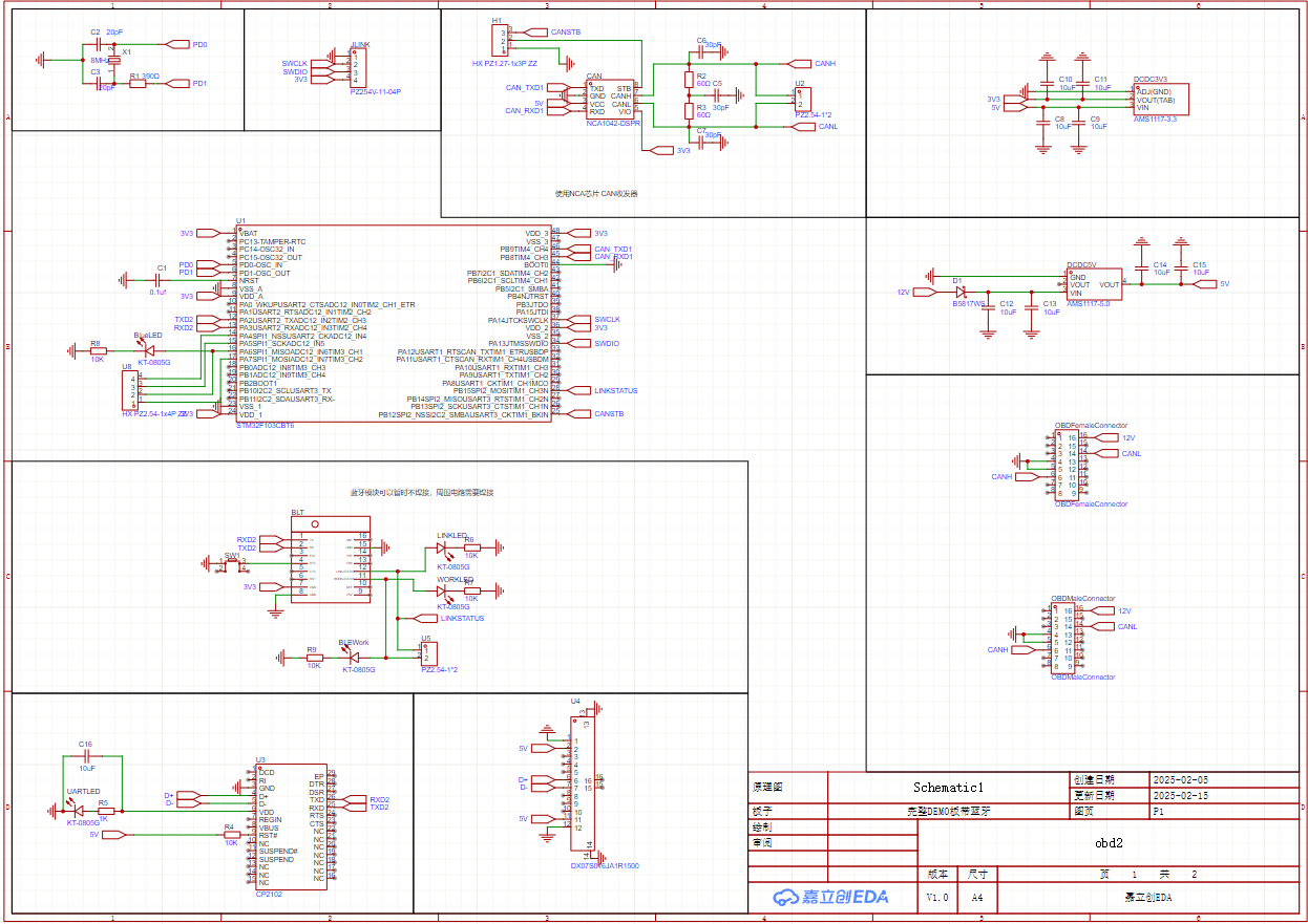 信号接收与处理:CAN 收发器负责接收汽车 OBD 口的 CAN 信号,并将其传输给 STM32F103。主控芯片对信号进行解析和处理,然后通过 UART 接口将数据发送给蓝牙模块。