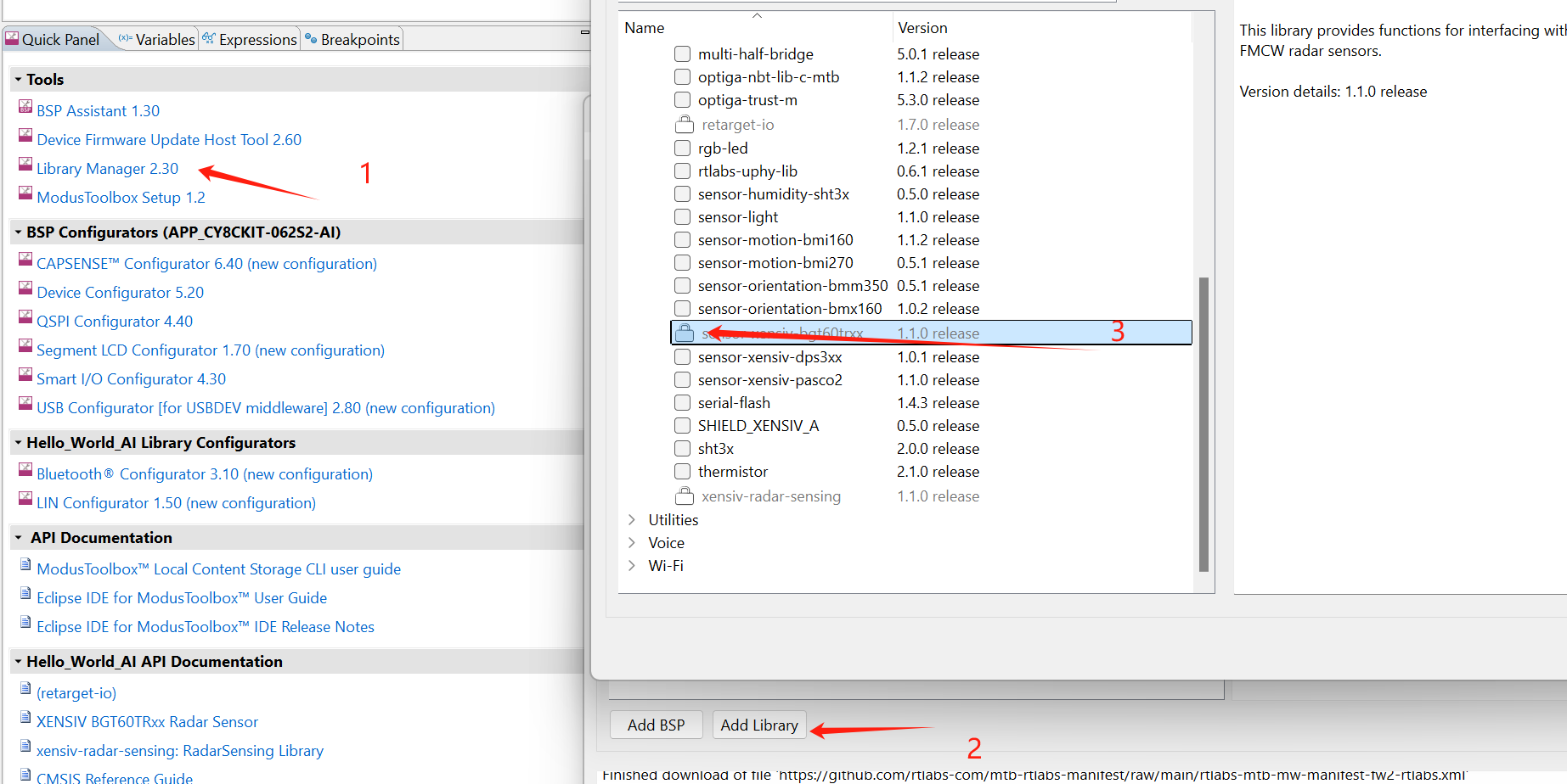 软件使用来自英飞凌的ModusToolbox工具,由于是官方的板卡,所以软件内集成了相关的示例,按照如下的步骤就可以生成测试案例,可以最快的速度验证传感器工作正常。