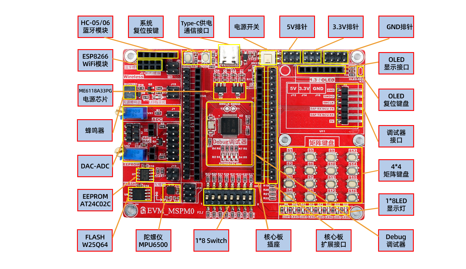 底板也采用Type-C接口供给5V电源,同时为核心板提供电源,并可向外输出5V、3.3V电源电压。底板集成了Debug调试器及虚拟串口,可通过SWD模式进行代码烧录和Debug调试,通过虚拟串口进行通信,集成SPI协议的1.3寸OLED显示屏、FLASH、陀螺仪、IIC协议的EEPROM,以及常见的矩阵键盘、蜂鸣器、8位LED、8位拨码开关等外设,并提供蓝牙、WiFi无线模块二选一接口。此外,还针对MSPM0L系列优秀的ADC和集成OPA运放,底板提供电感电容测量装置单芯片解决方案的基础电路。